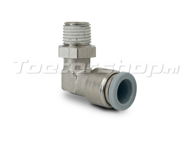 U kunt deze haakse koppeling dus in een 1/4 BSP ingang draaien en daar een 10 millimeter slang op aansluiten.