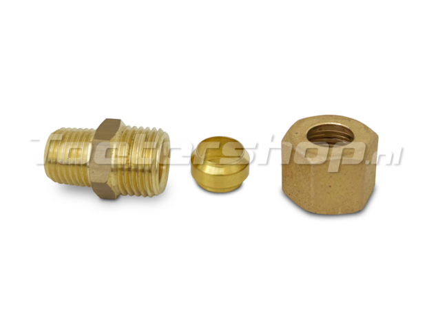 Messing koppeling om vast te draaien op een metalen leiding (o.a. koper, staal, messing) met een buitendoorsnede van Ø10mm.