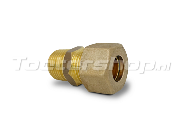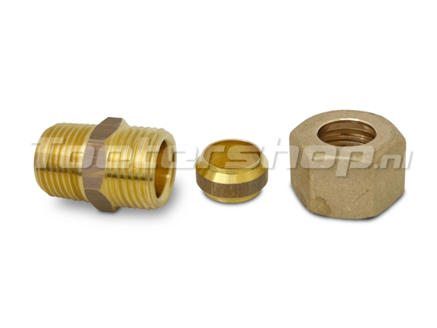 Messing koppeling om vast te draaien op een metalen leiding (o.a. koper, staal, messing) met een buitendoorsnede van Ø12mm.
