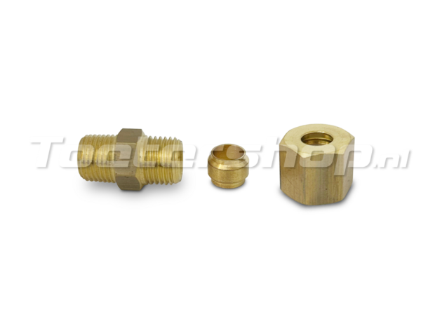 Messing koppeling om vast te draaien op een metalen leiding (o.a. koper, staal, messing) met een buitendoorsnede van Ø6mm.