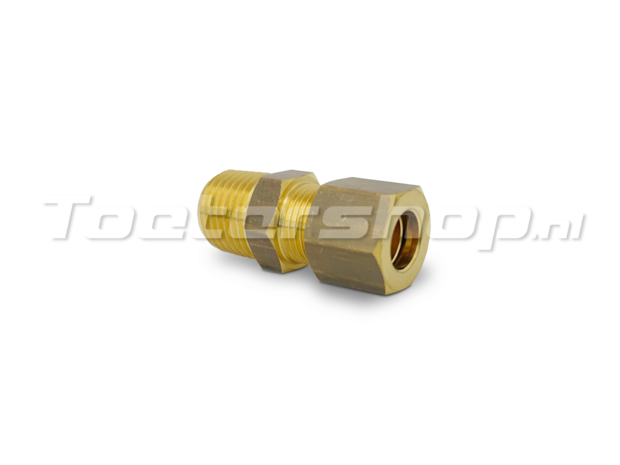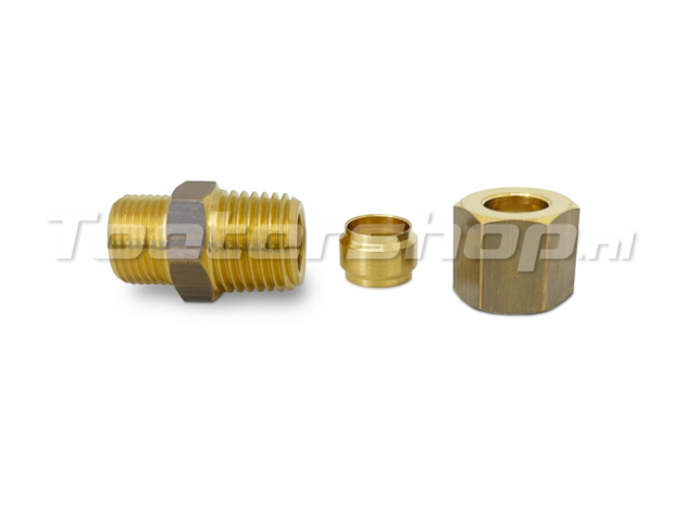 Messing koppeling om vast te draaien op een metalen leiding (o.a. koper, staal, messing) met een buitendoorsnede van Ø8mm.
