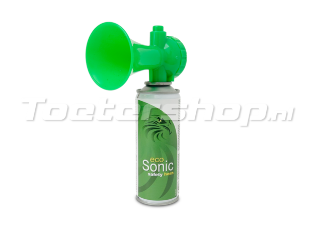 Milieuvriendelijke luchthoorn, of stadiontoeter. Voor sportwedstrijden, scheepvaart, of veiligheid. Gastoeter met eco-vriendelijk drijfgas. Voldoet aan de Europese norm. Refills verkrijgbaar.